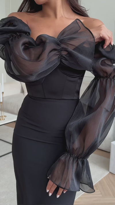 Limited edition crop top with spectacular voluminous sleeves in translucent fabric in black. The corset bodice perfectly emphasises the figure, creating a feminine and sophisticated silhouette. Slim cut lines in the neckline area add elegance, and airy sleeves create a play of textures, giving the look mystery and style. This crop top is perfect for evening outings or fancy events, pairing with both skirts and trousers. The bold cut and the combination of black top and white bottom create a harmonious and modern look.