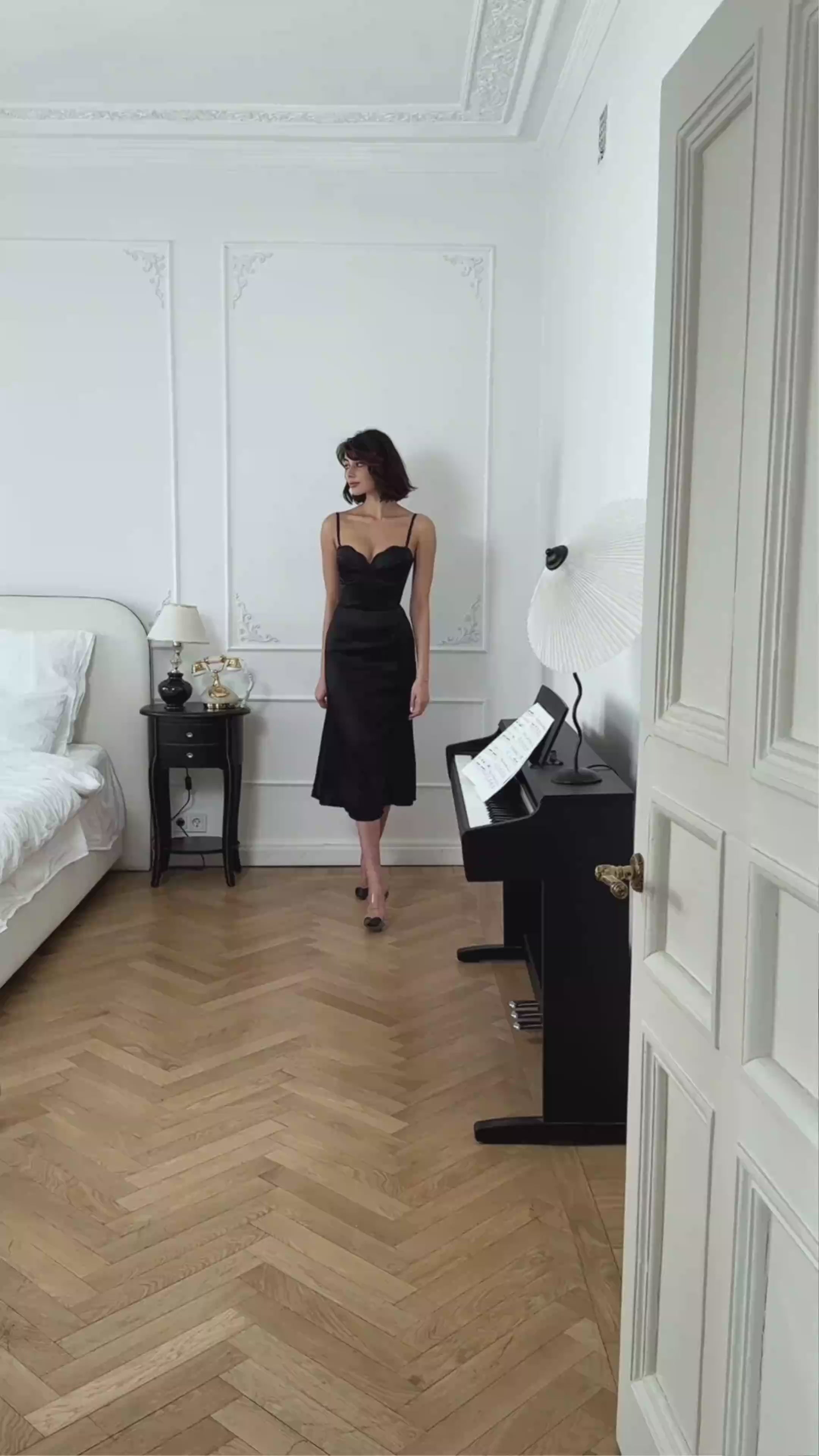 Elegant black midi dress with corset bodice and soft curves of the neckline creates a look with notes of luxury and femininity. The tight-fitting top emphasises the figure, while the smooth fabric flows smoothly along the silhouette, adding sophistication and grace to the outfit. The black colour gives the look a classic austerity, while the satin texture adds a slight sheen, making the dress suitable for evening outings. This dress is perfect for a special occasion, creating a spectacular and memorable outfit. Pair it with minimalist accessories for a finished, harmonious look.