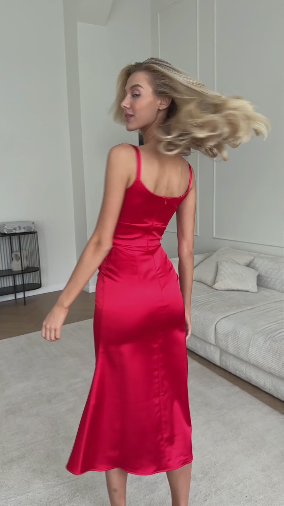 Bright red dress with thin straps is the embodiment of passion and femininity. The tight silhouette emphasises the figure, drawing attention to the smooth lines of the body. Deep neckline gives the image of seductiveness, and the rich red colour attracts the eyes and creates a feeling of confidence and grace. This dress is perfect for special occasions and evening events, making your look unforgettable and emphasising your natural beauty.
